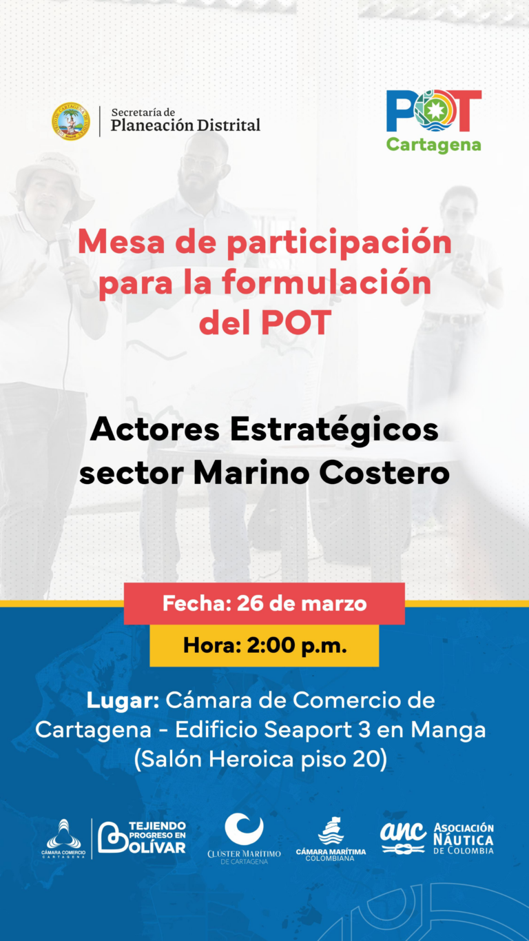 El espacio contó con el apoyo del Clúster Marítimo de la Cámara de Comercio de Cartagena, que facilitó el lugar de encuentro y apoyó la convocatoria del sector. La reunión se realizó el 26 de marzo de 2026 en la Cámara de Comercio de Cartagena, con la participación de gremios, entidades públicas y actores estratégicos del sector marino-costero.